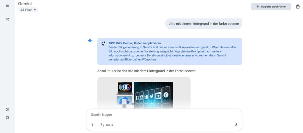Heute hat sich das grundlegend verändert. Statt dich durch Menüs und Funktionen zu kämpfen, reicht ein einfacher Satz an Google Gemini wie; „Mach den Hintergrund transparent“ oder „Füge einen Sonnenuntergang hinzu“. Die KI versteht sofort, was du möchtest, und setzt es direkt um – ganz ohne, dass du ein spezielles Programm öffnen oder dich mit technischen Details beschäftigen musst.